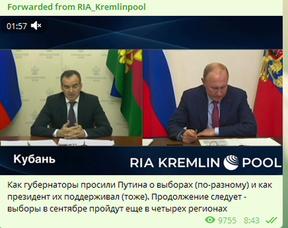 Телеграм-канал RIA Kremlin Pool опубликовал интересную нарезку кадров видеоконференций Владимира Путина с главами регионов, в которых в этом году пройдут губернаторские выборы.